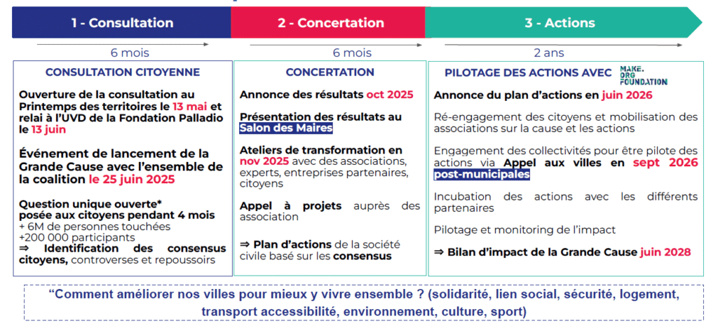 France Villes & territoires Durables est partenaire de la Grande Cause Mieux Vivre en ville, un projet d’intérêt général au cœur des enjeux actuels. Cette Grande Cause a démarré en mai 2025 avec une grande consultation nationale : “Comment améliorer ensemble la ville pour mieux y vivre ?” (solidarité, lien social, sécurité, accessibilité, environnement, culture, sport).