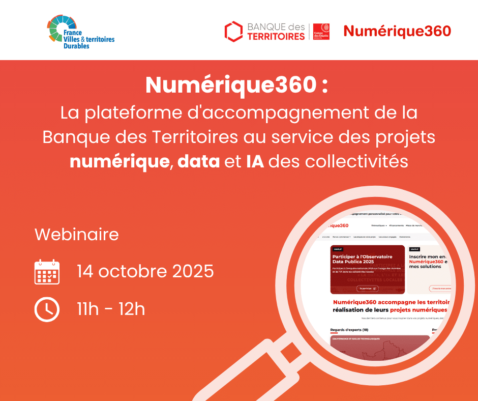 France Villes et territoires Durables et la Banque des Territoires vous proposent de (re)découvrir le webinaire de présentation de la plateforme Numérique360, une initiative lancée par la Banque des Territoires pour accompagner les collectivités dans la mise en œuvre de leurs projets numériques, d’intelligence artificielle (IA), et de donnée (data).