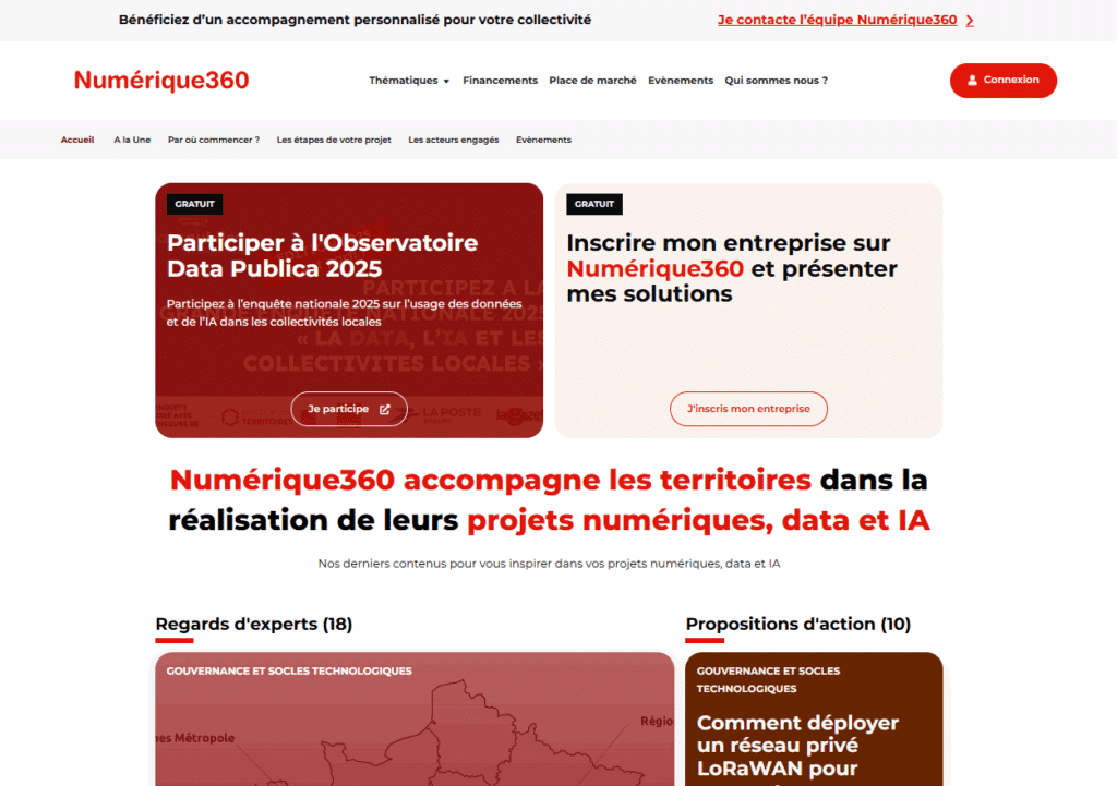 Numérique360 propose un parcours digital structuré et opérationnel permettant aux collectivités de s’orienter, de se former, de s’inspirer de retours d’expérience et d’identifier les expertises et solutions disponibles via une place de marché.