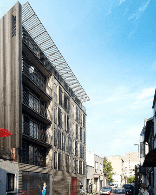 R+5 100% bois et filière sèche en technique ossature bois. Pas d’échafaudage pour le montage du bâtiment. Bois en structure et menuiseries, fibre de bois, bardage bois. Matériaux issus du recyclage avec Laine de verre Ecose de chez Knauf (80% verre recyclé), plaques Fermacell (20% papier recyclé), panneaux OSB et MFP (produits connexes de scierie). Matériaux récupérés issus de la démolition – charpente – pour reconstitution du mur séparatif et carrés potagers.