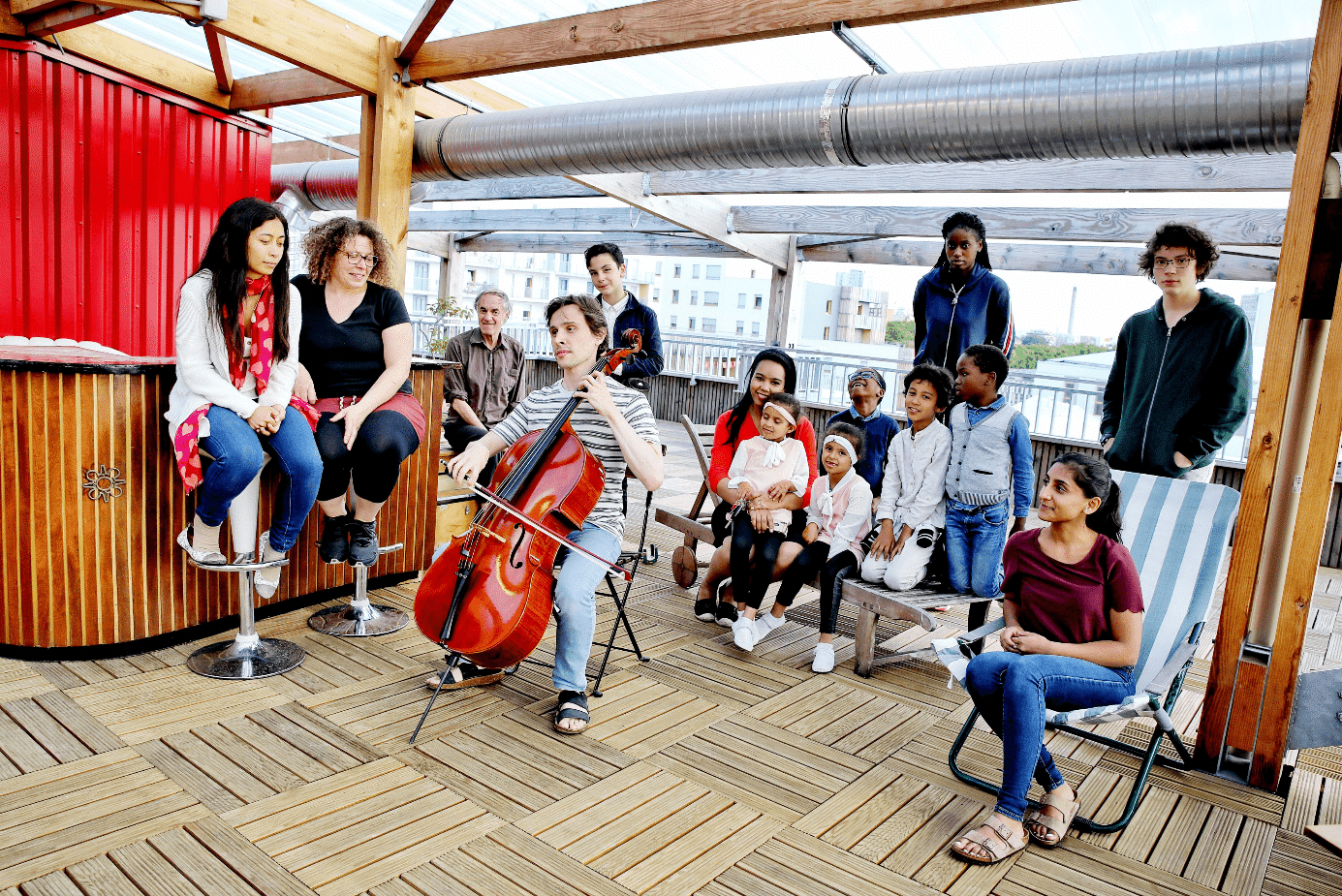 Le bâtiment en ossature bois. Le réemploi de matériaux issus de la déconstruction est dans ce projet une préoccupation majeure. Ainsi, dans un souci d’économie de ressources et d’énergie, les murs de la serre dédiée à l’agriculture urbaine en toiture ont été en matériaux de réemploi. Les meubles des parties communes ont été fabriqués par les habitants avec des matériaux de récupération (anciens volets) et permettront le partage et la mutualisation d’équipements. Des prototypes de ces meubles ont déjà été créés en partenariat avec l’association BELLASTOCK. ).
