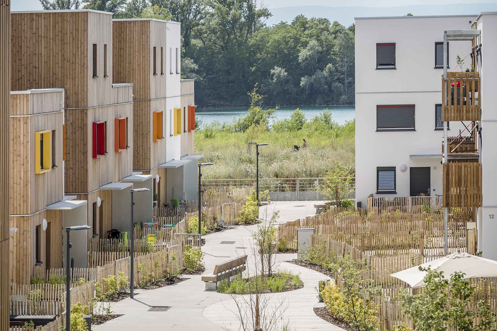 Cet éco-quartier développe un schéma d’urbanisation unique et spécifiquement pensé pour répondre de manière douce, adaptée et innovante à la question de l’inondabilité du site. Les bâtiments de logements sont implantés sur 5 pontons habités « flottant » au-dessus d’une prairie inondable. Chaque ponton accueille une mixité de logements à la fois sociaux et en accession libre, entremêlant habitations individuelles, intermédiaires et collectives. La part belle est laissée au paysage, à la végétation, aux espaces ouvertes et partagés, autour d’un cœur de ponton vivant et convivial. On trouve au total 305 logements.
