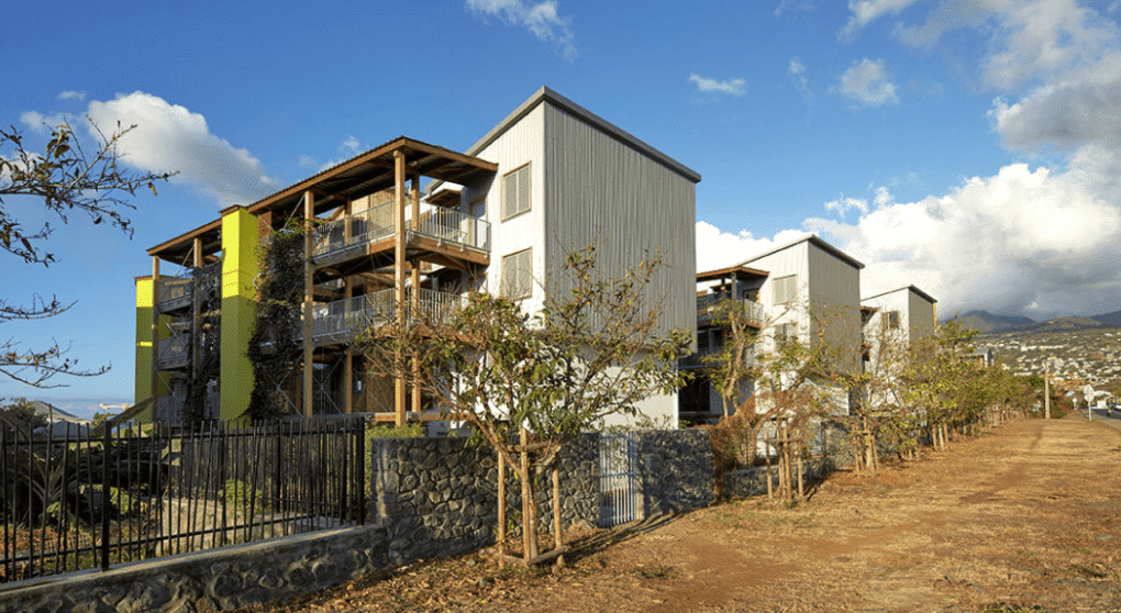 Ce projet de logements sociaux, menée par une SEM locale, la SEMADER, ne visait aucun objectif de ce type car cela risquait de déséquilibrer le montage financier de l’opération. Les concepteurs s’appuient juste sur les données bioclimatiques du site afin d’apporter une réponse efficace et low-tech afin d’offrir le maximum de confort aux habitants. Sans équipement actif et avec une production ECS, l’opération vise une consommation d’énergie primaire de 92,00 kWhep/m2.an contre 145.00 kWhep/m2.an pour une opération standard à La Réunion (Méthode de calcul RTAA DOM 2012).