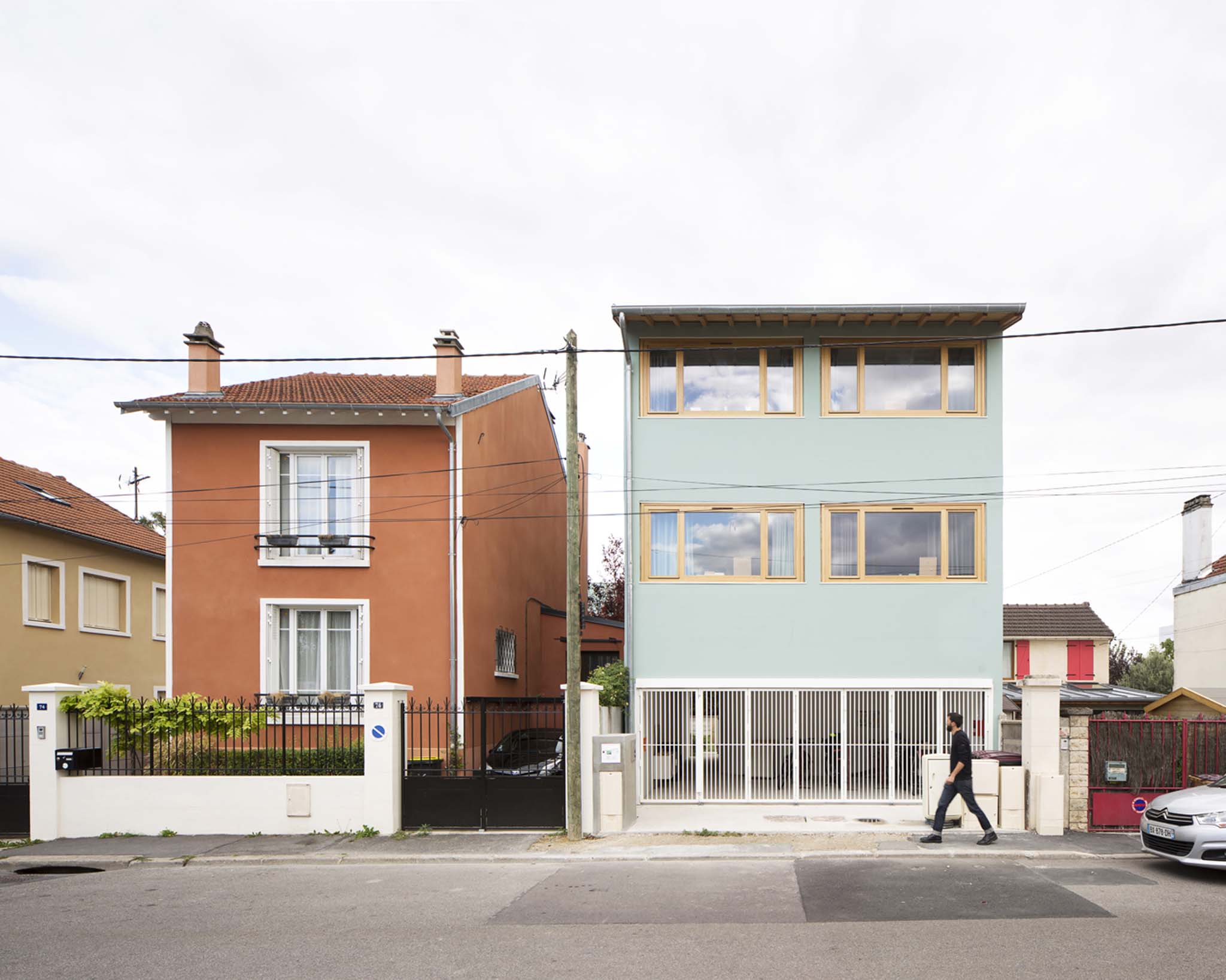 La parcelle est une parcelle en drapeau, issue du découpage d’un ténement ayant servi de lieu de stockage pour des buses de VRD. Le contexte est celui d’une rue pavillonnaire calme qui suit la ligne de crête du plateau de Romainville, anciennement exploité comme carrière de gypse. La position en point haut permet au projet de révéler la géographie francilienne, tout en cherchant à dialoguer avec l’environnement pavillonnaire proche.