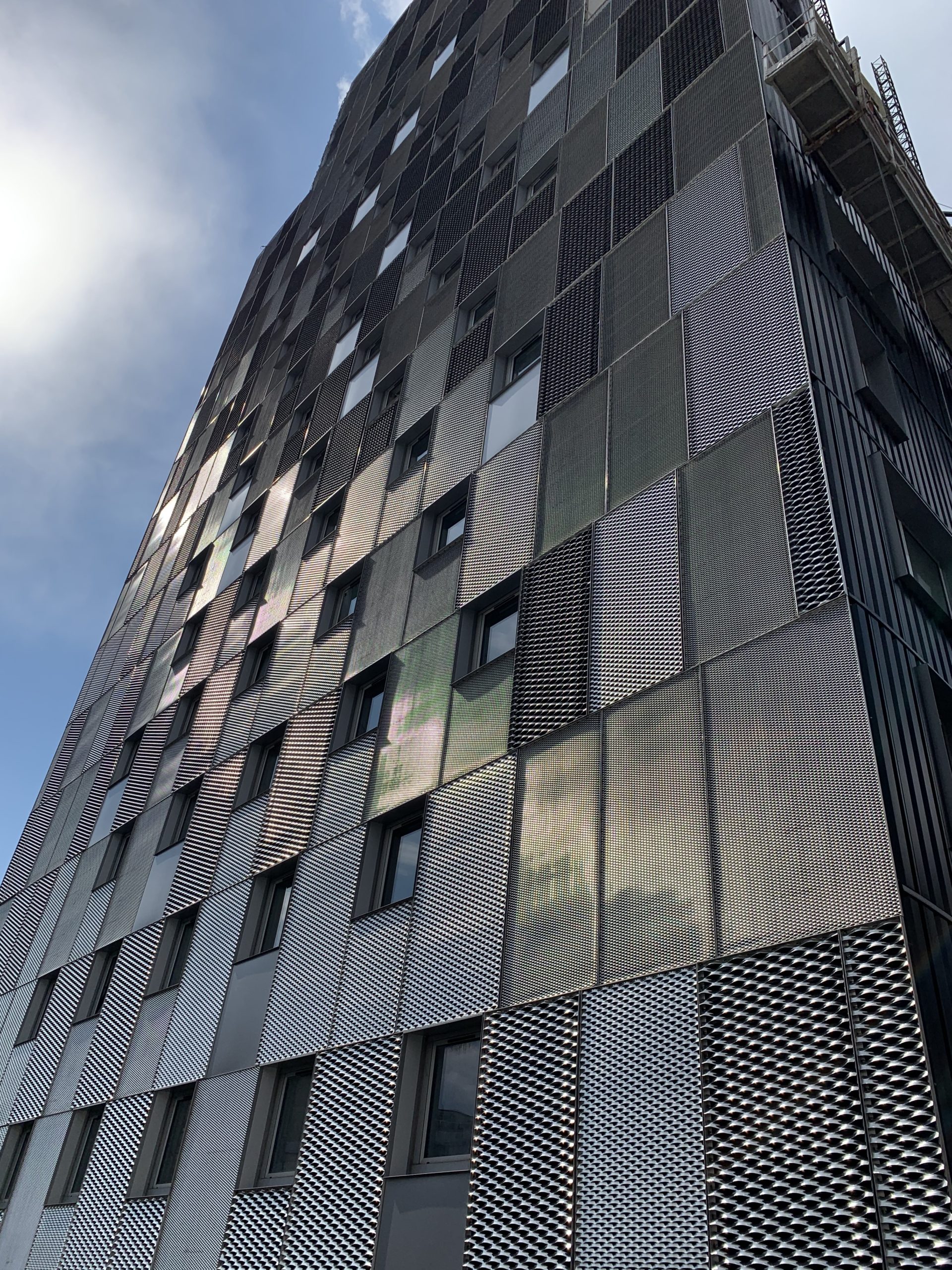 – déploiement en façade d’une nouvelle peau isolante et légère en résille de métal déployé qui permet de modifier l’allure globale du bâtiment avec un apport réduit de nouveaux matériaux